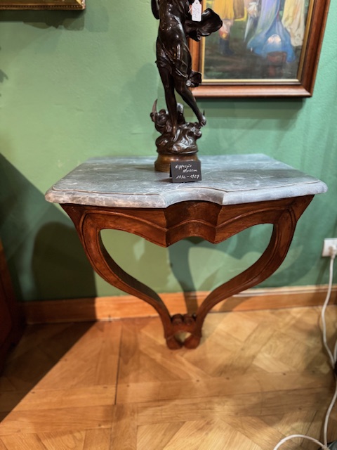 Console en bois peint en gris d'époque Louis XV de forme arbalète de la région de Fourque dessus de marbre vert de la région de Campanen Hautes -Pyrénées . Dimensions : Longueur 107 cm Hauteur 81,5 cm Profondeur 62 cm ...