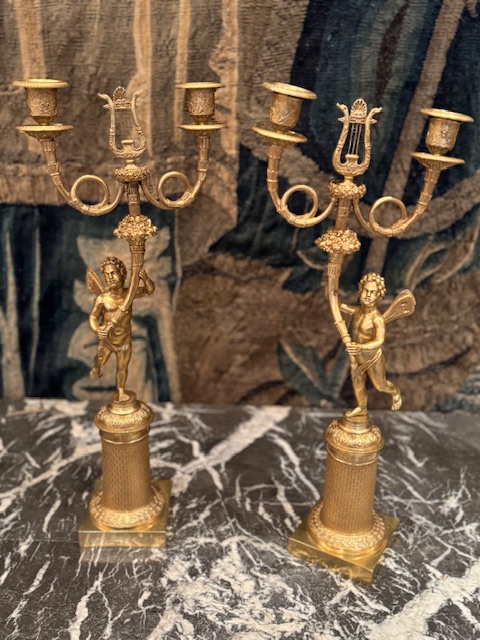 Paire de candélabres d'époque Empire à 2 feux à décor d'enfants et surmonté d'une lyre finement ciselé. Dimensions :Hauteur 49 cm Largeur 19 cm Profondeur 9,5 cm...