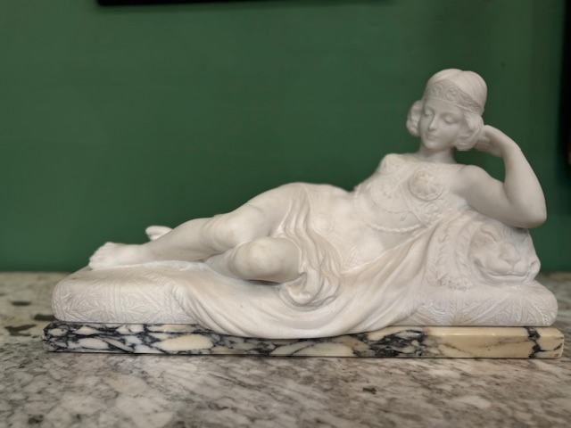 "Marbre orientaliste signé Pugi" Odalisque en marbre trés finement sculpté détail des vétements représentant une femme allongé orientale sur un sofa signé Guglielmo Pugi (1850-1915) est un sculpteur florentin actif entre 1870 et 1915. Certaines oeuvres de Pugi sont exposées au Musée d'Albatre de la ville de Volterra . Il a réalisé le buste du roi Humbert 1er qui se trouve sur la grand place de Fiésole. Des sculptures de Guglielmo Pugi ont été présentées à l'Exposition Pan-Américaine de 1901 à Buffalo (New-York) ainsi qu'à l'exposition Universelle de 1904 à Saint-Louis (Missouri) Dimensions :Longueur 54,5 cm Hauteur 32 cm...