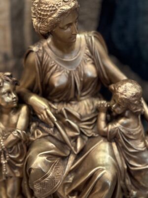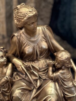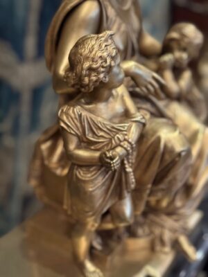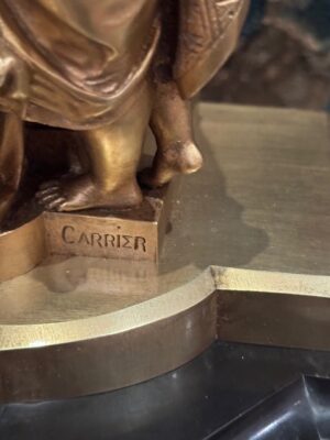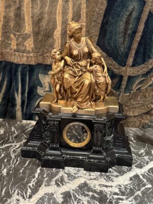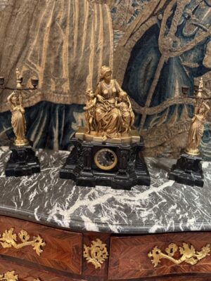 Garniture de cheminée en bronze représentant Femme et 2 enfants néoclassique signé Carrier Belleuse posée sur marbre noir