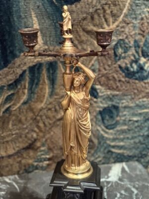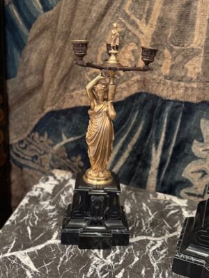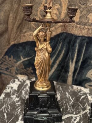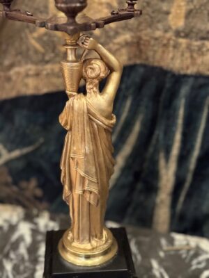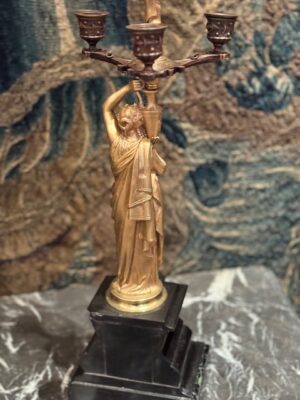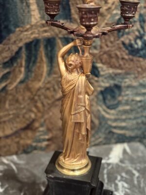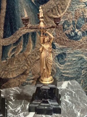et une paire de candélabres à figure de jeune femme drapée à l’antique tenant un vase sur son épaule d’où jaillit un chandelier finement architecturé socle de marbre noir .