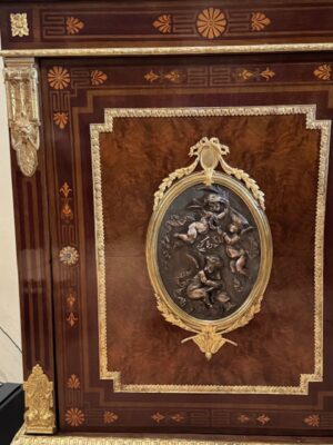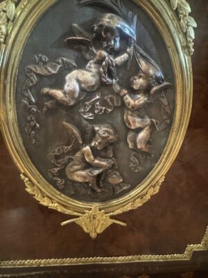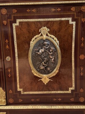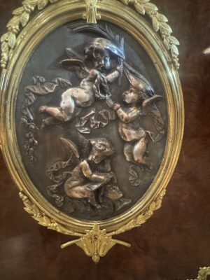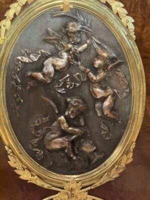 Le médaillon central est signé Mme Léon Bertaux,célèbre sculptrice connue en son époque pour son succès dans les expositions universelles, ou elle sera déclarée hors concours. C’est la première femme a recevoir une médaille d’or dans sa spécialité.