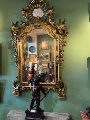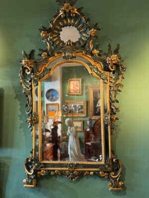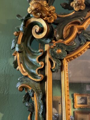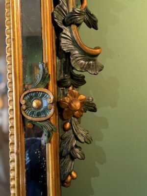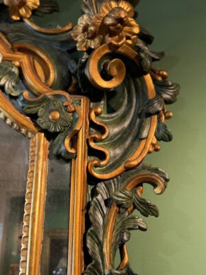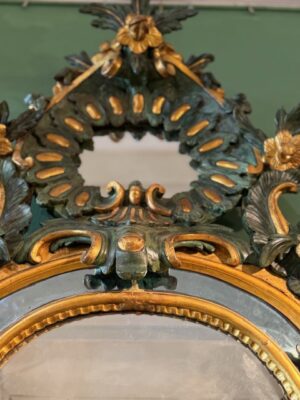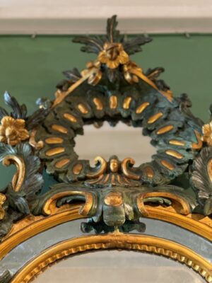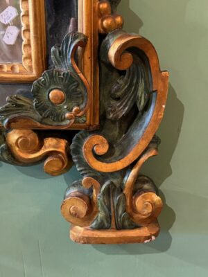 Miroir Vénitien en bois peint en vert et doré d’époque Louis XV très beau travail de sculpture de feuilles d’acanthe peinture et dorure reprises au 19ème .