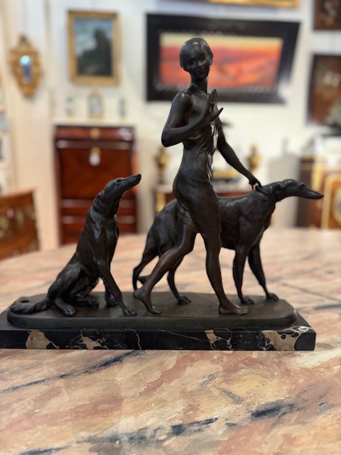 Jeune femme aux 2 lévriers en bronze à patine brune sur un socle en portor signé Louis Riché 1877-1949 . Alors âgé de seulement dix-neuf ans, il est le plus jeune sculpteur à être exposé au Salon. Par la suite, son travail minutieux de bronzes animaliers le fait entrer dans plusieurs prestigieuses expositions parisiennes. Il continue à sculpter et à créer jusqu'à sa mort en 1949. Dimensions: Hauteur 43 cm Longueur 48,5 cm Profondeur 13 cm...
