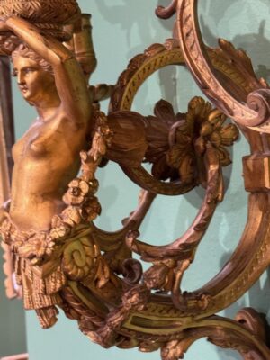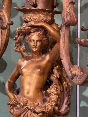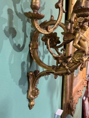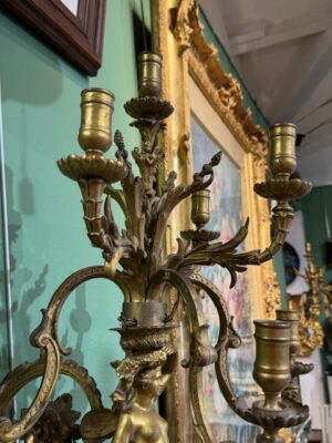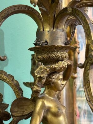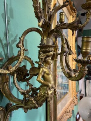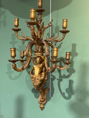 14 Fév Paire de grandes appliques en bronze Posted at 09:30h in Appliques, Objets divers by Paul Paire d’appliques fin 19 ème représentant des personnages dénudés(femme et homme) à 8 bougeoirs. Dimensions: Hauteur 70 cm Profondeur 40 cm Largeur 38 cm