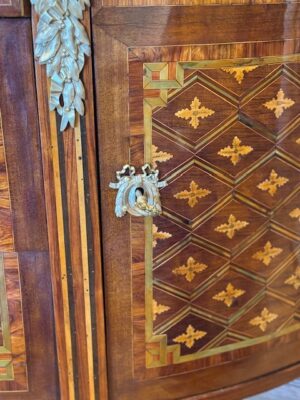 COMMODE DE FORME DEMI-LUNE en placage d’amarante, d’acajou, de sycomore marqueté d’un filet brisé, de motifs losangés à fleurons. Elle ouvre à trois tiroirs au centre et à deux vantaux latéraux. Ornements de bronzes dorés tels qu’entrées de serrures et médaillons feuillagés. Pieds fuselés à cannelures simulées, à bagues et sabots en bronze.. Attribué P. Roussel . Époque Louis XVI. Haut.90 cm – Larg. 128 cm – Prof. 58cm
