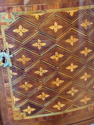 Pierre Roussel (1723-1782), reçu maître le 21 août 1745. Pierre Roussel est l’un des meilleurs ébénistes du XVIIIe siècle. Sachant s’adapter au changement de goût, il créa des décors de frisages, des trophées, des bouquets de fleurs, exploita le laque, toujours à la recherche de la couleur et de la fantaisie. Il travailla pour son confrère Migeon et « on sent sur lui peser principalement [son influence], avec ses lignes galbées un peu lourdes, ses commodes à tablier descendant très bas. » (Verlet, p. 152). Son savoir-faire s’épanouit au moment de la transition du Louis XV au Louis XVI et il est reconnu comme « l’un des premiers ébénistes » de Paris en 1768 (Almanach de Vray Mérite). (Kjellberg, p. 729). Bibliographie : P. Kjellberg, Le Mobilier français du XVIIIe siècle. Dictionnaire des ébénistes et des menuisiers, Les Éditions de l’Amateur, 1989 P. Verlet, Les Meubles français du XVIIIe siècle, t. II, PUF, 1956. - Dimensions : Longueur 128 cm Hauteur 90 cm Profondeur 58 cm