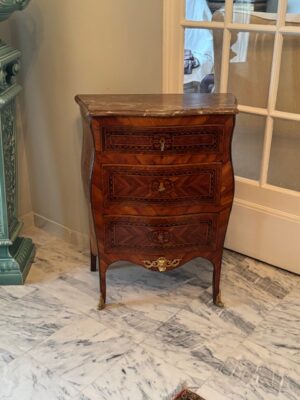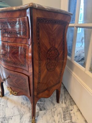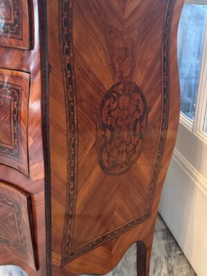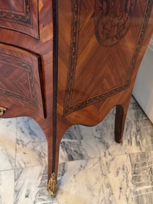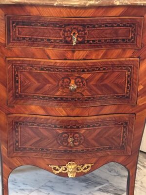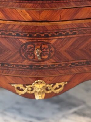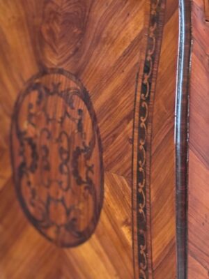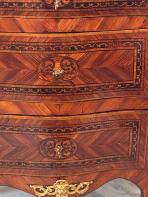 CommodeTransition Louis XV -XVI d’époque 18ème Italienne d’entre-deux marquetée de filets de citronnier et de placages de bois de rose .